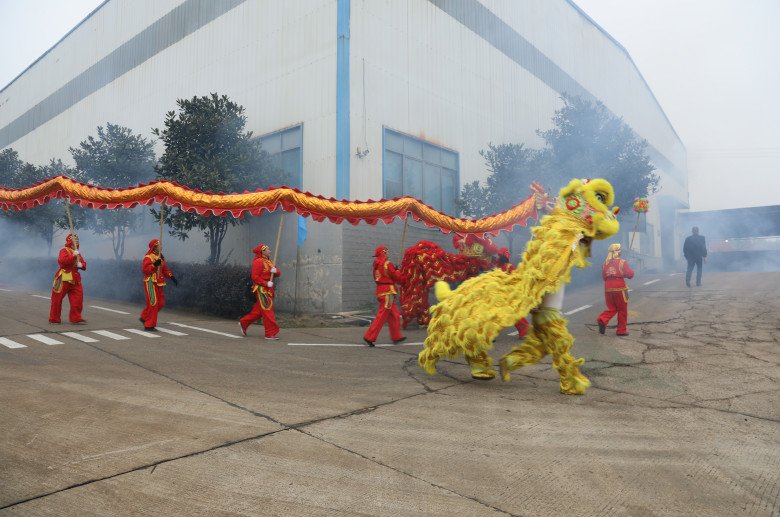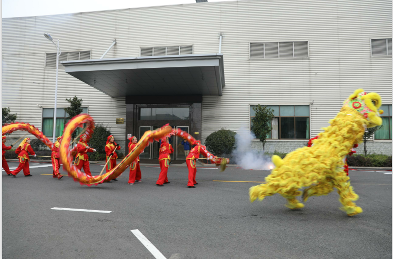 現場,一條長約十余米、火紅色的龍在空中不斷翻飛,舞龍的師傅們個個精神抖擻,步伐矯健,伴隨著激昂的鼓點,迎合著現場的鞭炮聲和歡呼聲,先是在公司門口,隨后隊伍從精密車間到鑄造車間,再到新辦公樓,獅龍環廠一周,每到一個車間,各車間早已準備好鞭炮,歡迎著象征吉祥如意的獅龍!